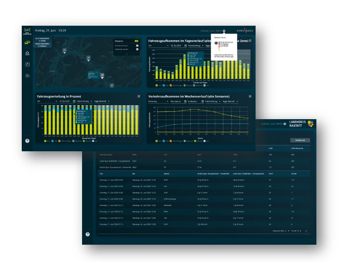 Umfassende Visualisierungen: Karten und Diagramme zeigen Verkehrsaufkommen, Fahrzeugverteilung und zeitliche Trends