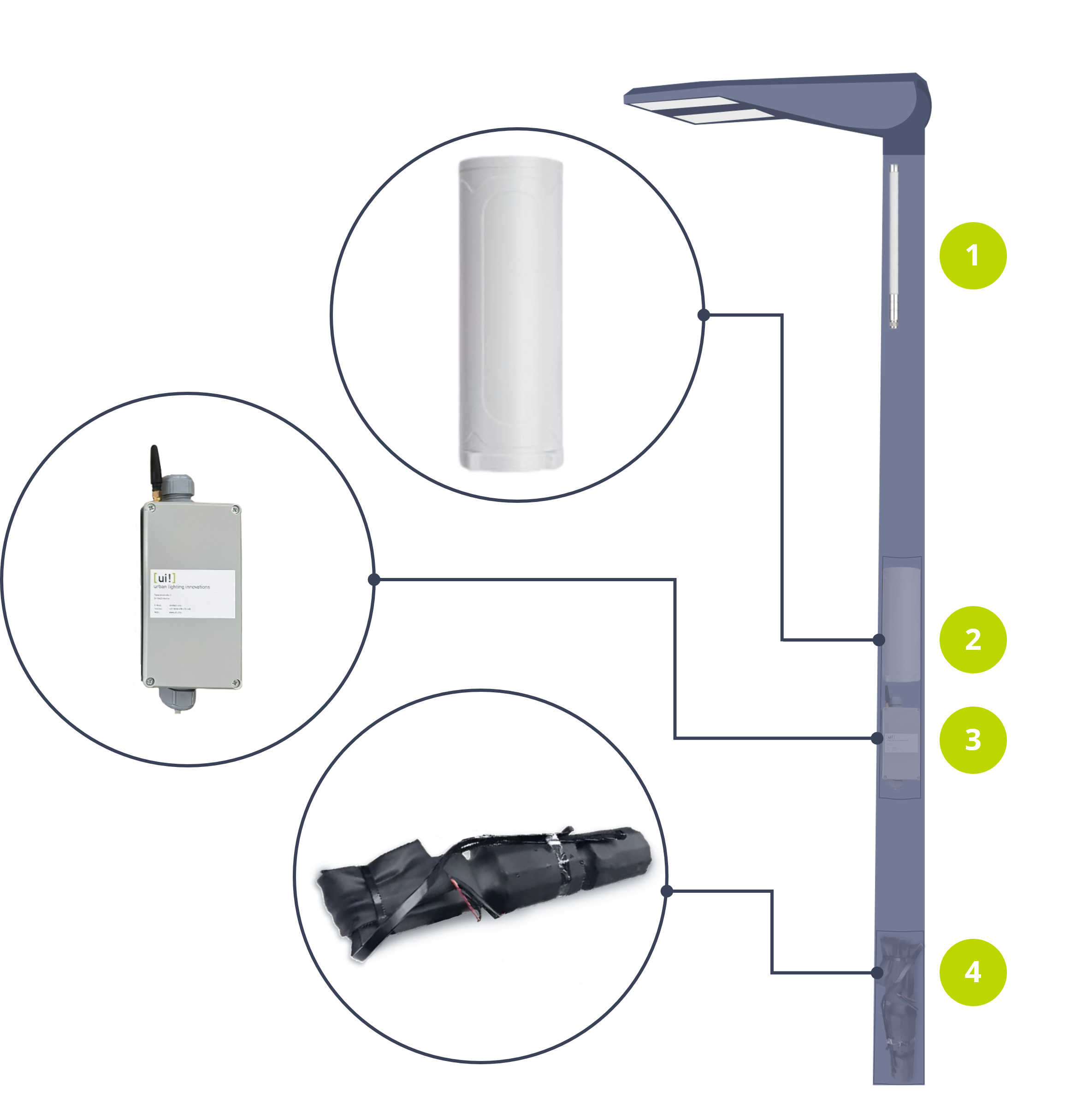 Das [ui!] LoRaKit ist ein für den Einbau in bestehende Lichtmaste optimiertes Gesamtsystem. Es besteht aus mehreren, exakt aufeinander abgestimmten und vielfach etablierten Komponenten